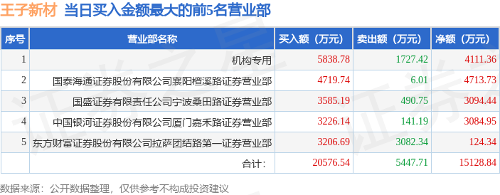 证券之星消息,沪深交易所2025年5月29日公布的交易公开信息显示,王子新材(002735)因日涨幅偏离值达到7%的前5只证券比较正规杠杆配资平台,日换手率达到20%的前5只证券登上龙虎榜。此次是近5个交易日内第5次上榜。